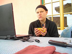 Die Putzfrau, die mich schon seit Jahren kennt, fragt mich, ob es mir denn nicht gut ginge, ich würde so traurig aussehen. Kleine Albereien werden durch den langen Raum geworfen. Dann bin ich wieder komplett allein. Menschen kommen und gehen, eine Frau fragte mich, ob ich denn schon fleißig sei. Immer diese Standardfrage. Dann kommt ein Mann hereingeschneit, brilliert kurzfristig als Zappingmeister, um sogleich bei einem Motorradrennen hängen zu bleiben. Igitt! Auch der mitgebrachte Tee schmeckt mit allmählicher Leerung der Infusionsflasche immer weniger. Bald ist es geschafft und ich bin froh, eine sehr gesprächige und sympathische junge Rotkreuzfreiwillige hinten bei mir sitzen zu haben.