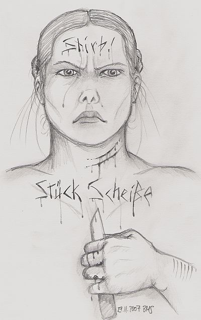 Tiefe Kerben, links und rechts. 50 oder 70. Klaffende Schnitte auf den Handbeugen über den Pulsadern. FEIGLING!!! Es wurden Fragen zu meiner Bulimie gestellt. Nach dem Essen war mir dann wirklich nach Kotzen. Doch nicht das Essen ist das Problem, ICH bin das Problem und ICH sollte mich im Klo runterspülen. Wertlos. Ich bin wertlos, warum sonst müsste ich lügen? Weil ich es so wie ich nun mal bin NICHT wert bin. Nur alles retuschierendes Grinsen und Schweigen. Wer glaubt, mich zu kennen, irrt.
